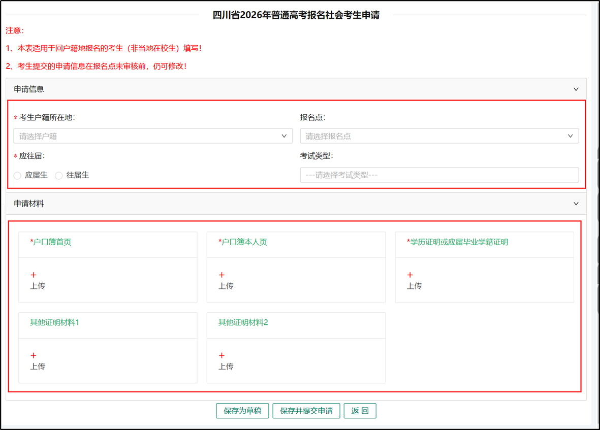 考生根据要求填写申报信息及上传所需材料,点击保存并提交申请即可。
