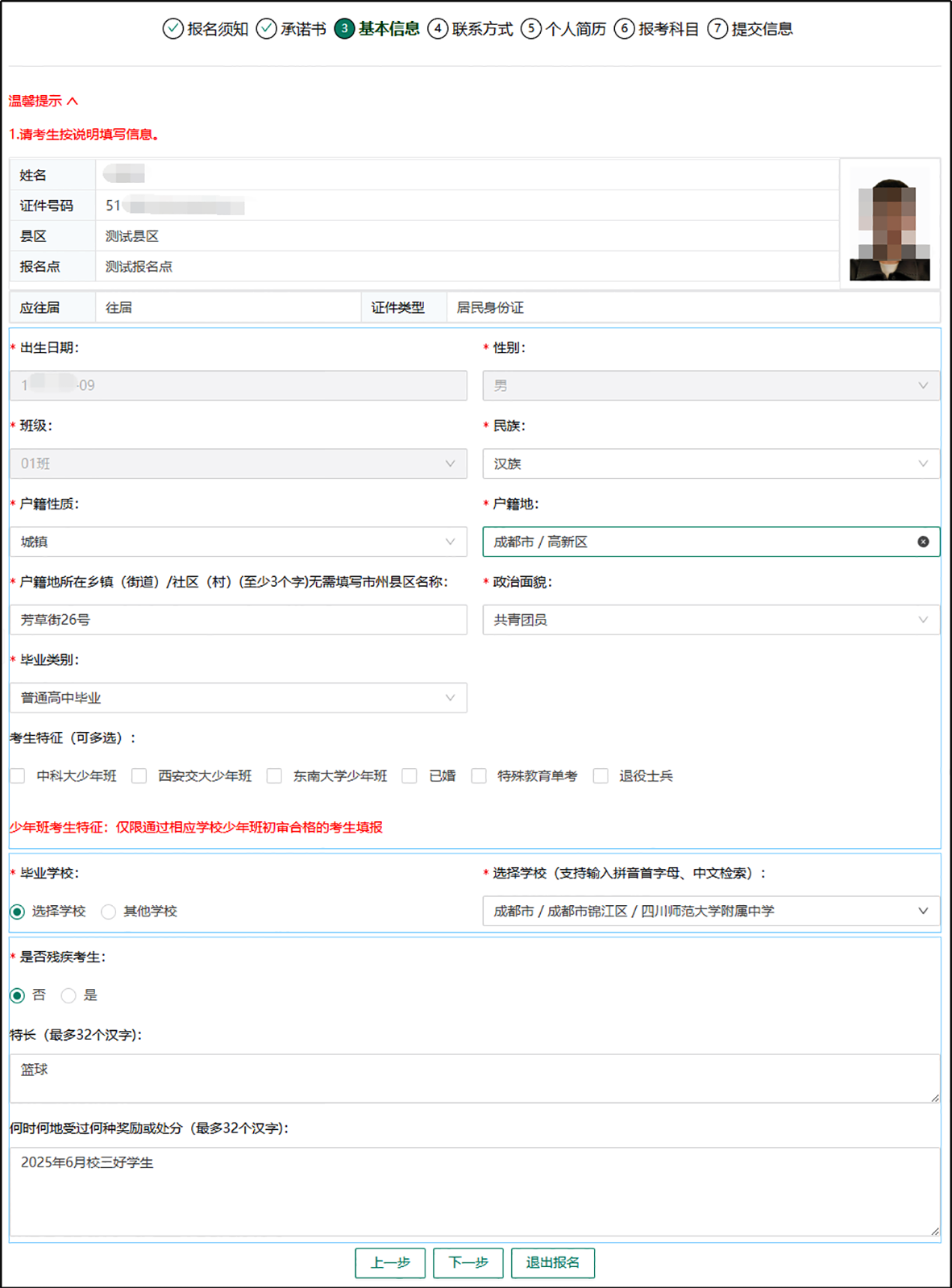 姓名、证件号、县区、报名点等信息已经在系统显示,考生按照报名表要求填写其他信息,包括民族、户籍性质、户籍地、政治面貌、毕业类别、毕业学校、是否残疾考生等。填写完成后点击下一步。